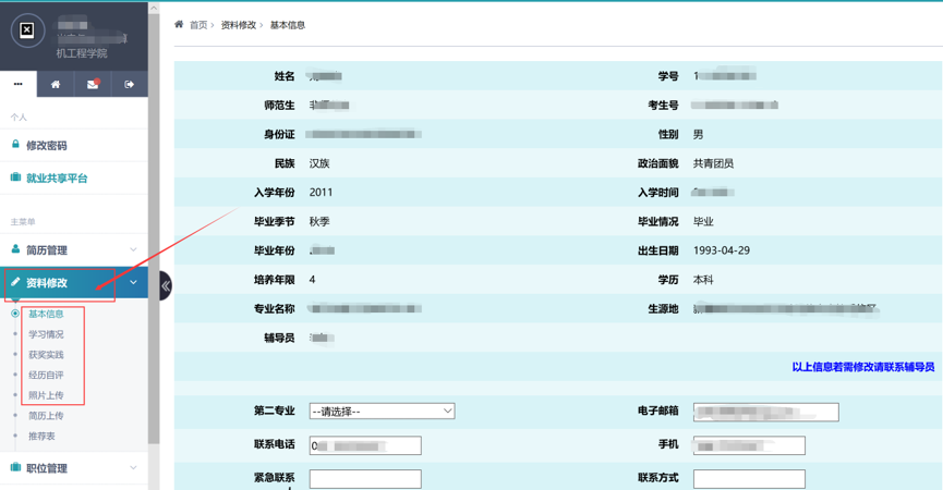 登陆就业系统后,在个人控制面板中的“资料修改”