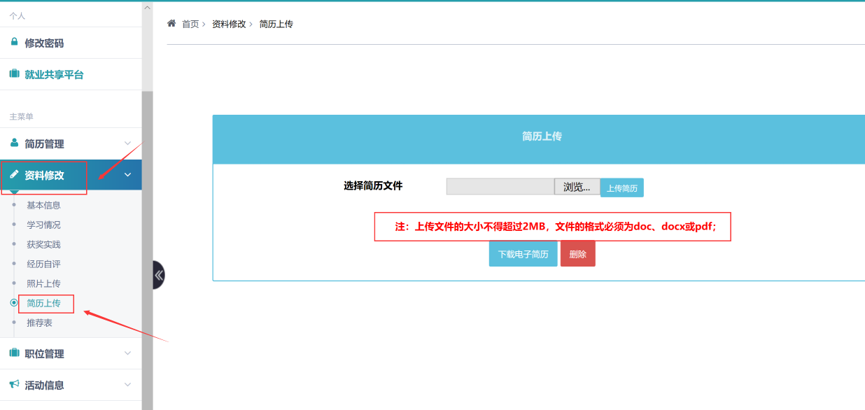 在“资料修改——>简历上传”模块中,请注意上传文件格式的要求。