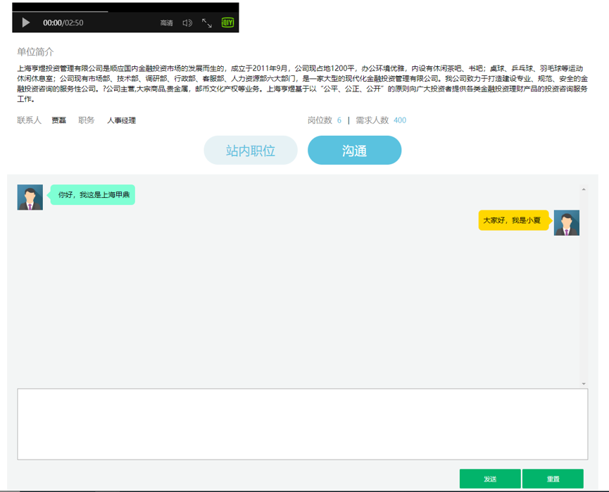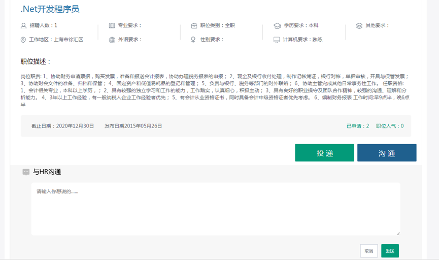 可以的。网络招聘会可以实现在线申请职位。每个职位都可以与用人单位HR进行沟通交流。如图:
